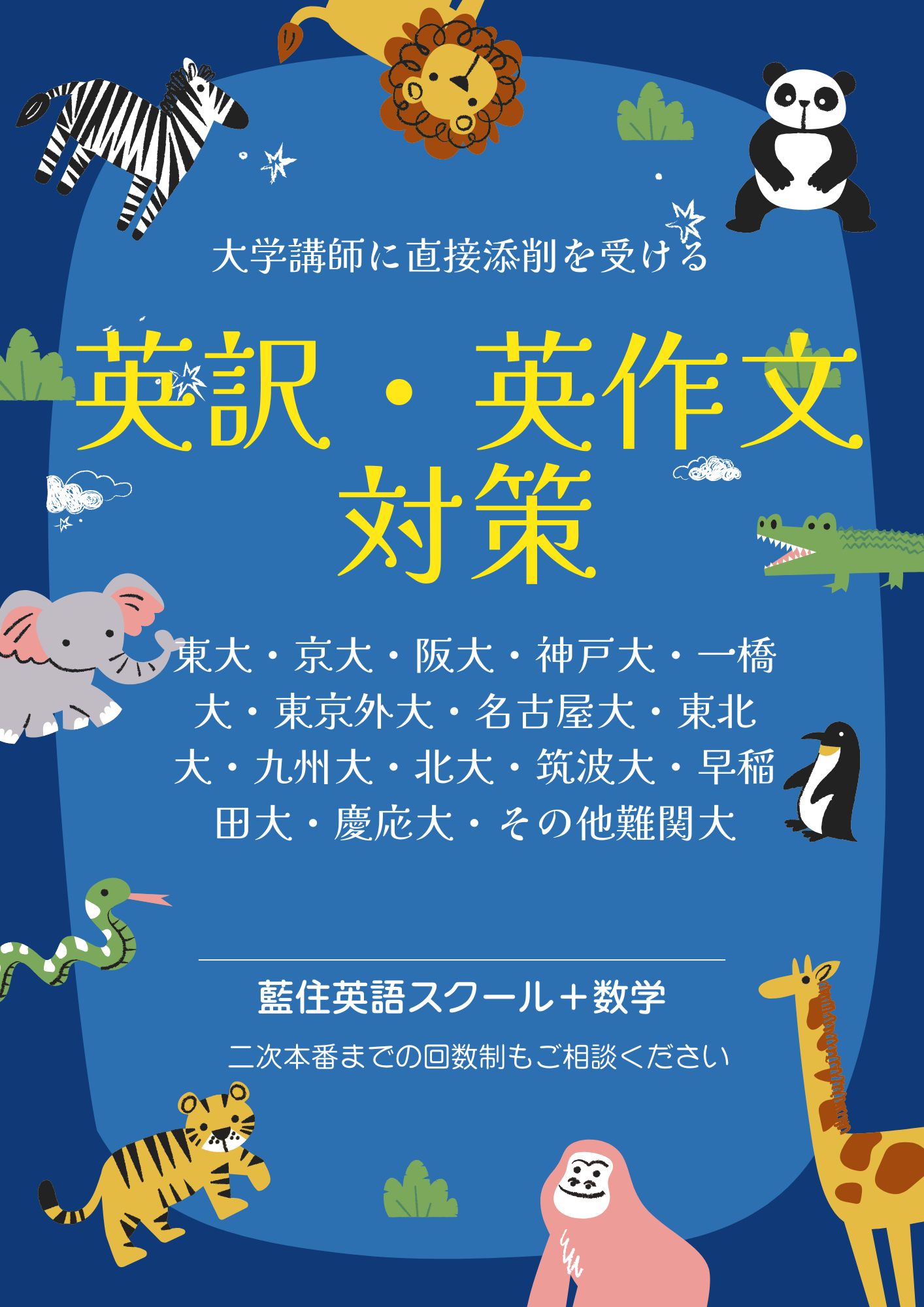 東大・京大・阪大・神戸大・北大・筑波大・東北大・名古屋大・一橋大・九州大・横浜国大・東京外大・早稲田大・慶応大… 難関大二次に英訳・英作文が出る方、国立大学講師に直接指導・添削を受けるチャンスです。直前の駆け込み対策対応いたします。